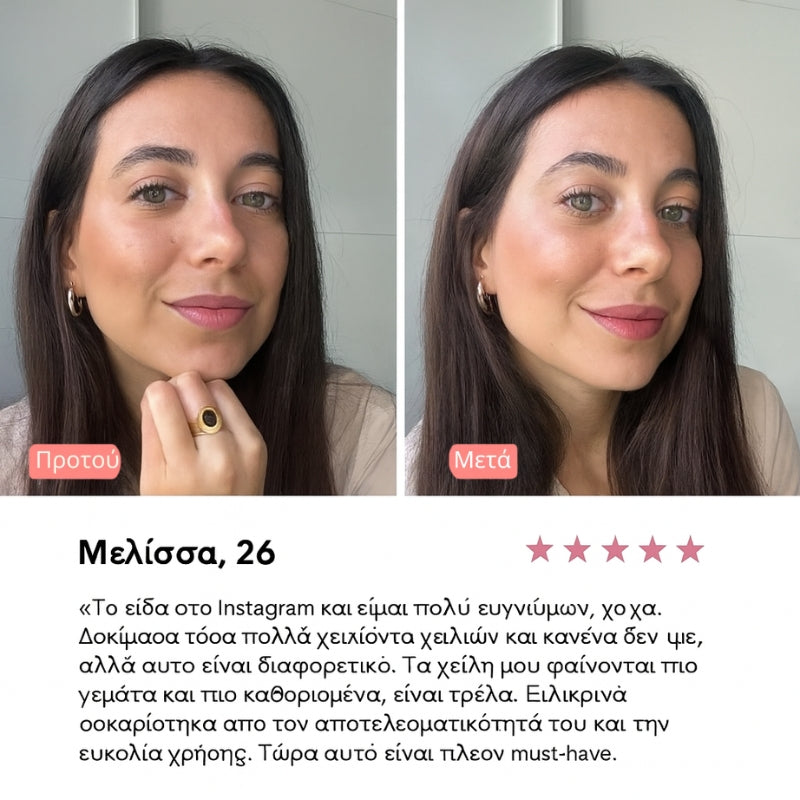 ✅ Ενυδάτωση + Όγκος — θρέφει ενώ γεμίζει τα χείλη