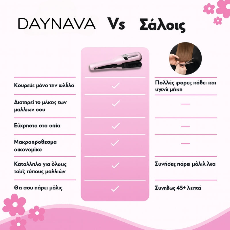 Το Daynava Split Ends Trimmer στοχεύει μόνο τις φθαρμένες άκρες, αφήνοντας τα μαλλιά σας υγιή, πλούσια και ακαταμάχητα λεία.